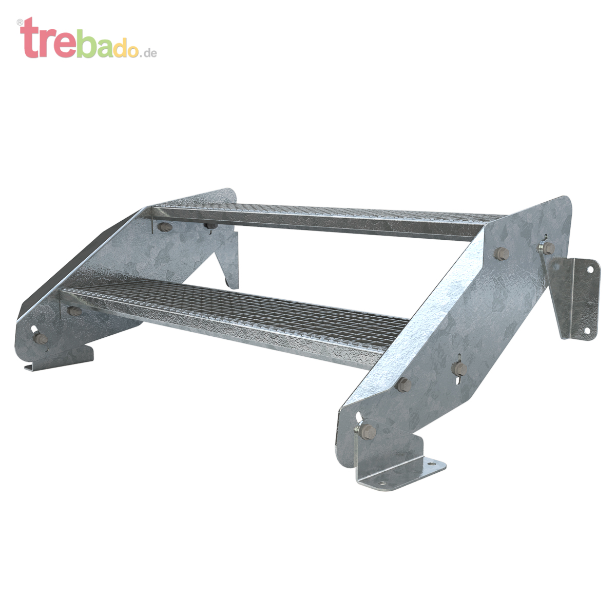 Feuerverzinkte Stahltreppe mit 2 Stufen, Geländer einseitig, optional auch mit zweiseitigem Geländer wählbar.